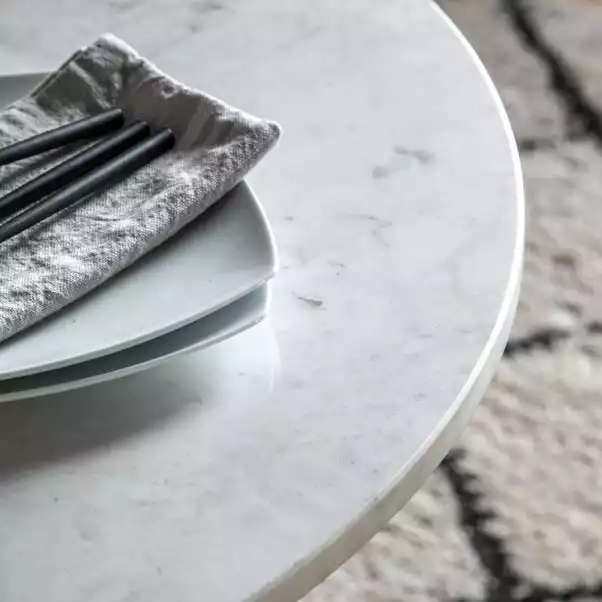 Dine with style and elegance with the Valemont Dining Table, a round table top, flowing shapes on the base and a clean marble top. Suitable for 4 seats and available in black or gold metal colour options, this table has a unique and exceptional design feature where the legs are designed to create a delightful raindrop movement without compromising on the solid base. Includes: 1 x table top, 1 x table legs & fixtures.